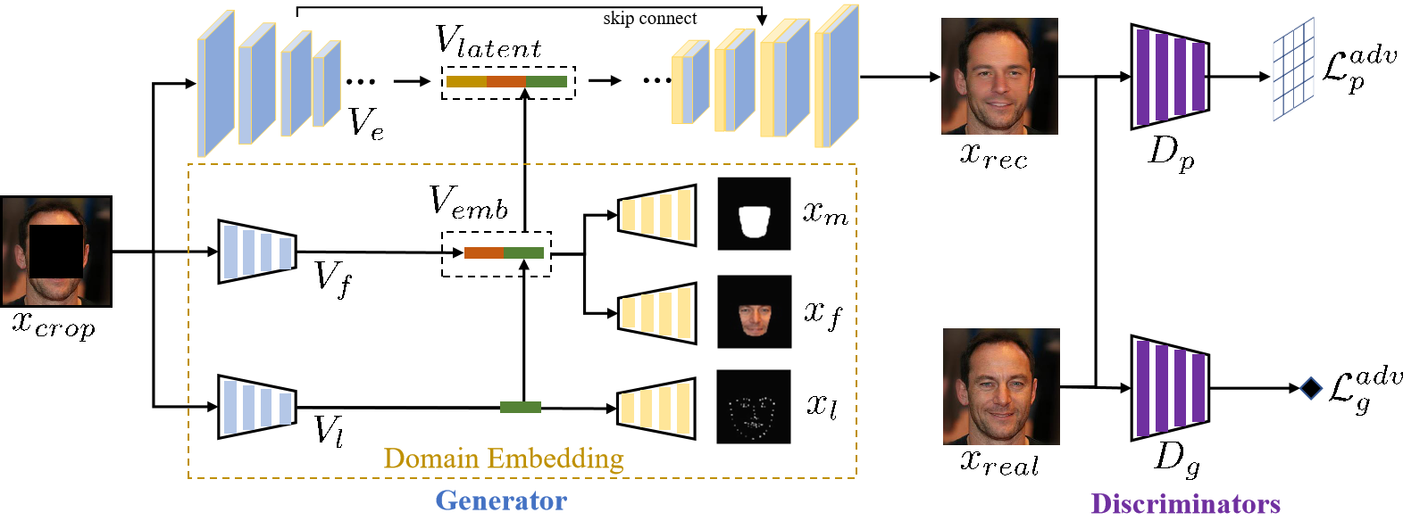 该研究成果提出了一种通过预测人脸的结构、内容和轮廓信息并加以融合成域信息以完成人脸补全的DE-GAN方法。该方法借用VAE使人脸的结构信息为主导信息,解决了现有人脸补全技术出现的生成人脸结构扭曲、人脸不对称的问题,该方法生成的人脸图像更加自然和谐,超越了当前该领域的SOTA方法,具有较优异的补全结果。