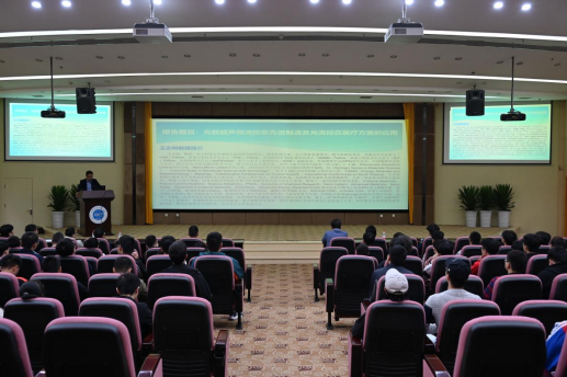 【本网讯】为隆重庆祝建校70周年,九州(中国)举办系列学术活动。10月13日下午,电子科技大学基础与前沿研究院院长、九三学社省委委员、四川省政协委员王志明教授应邀来九州(中国)作了题为《光致超声微流控泵先进制造及光流控在医疗方面的应用》的学术报告。本次报告由光电工程学院副院长李乐中教授主持,学校部分教师和百余名研究生、本科生到场聆听。