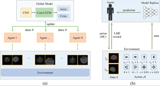 该研究提出了一种基于异步时序智能体的配准算法,通过训练一个强化学习智能体执行简单的离散动作模拟医学专家对图像进行渐进式的自动配准。该方法可以将传统意义上二维的图像配准转化为具有序列信息的三维空间学习问题,并设计出了一个自定义的由固定点误差驱动的奖励函数来引导强化学习智能体向正确的配准策略学习。该研究在临床医学中多模态鼻咽癌数据(CT、MR图像)中进行了评估。结果表明,该方法在医学图像刚性配准的精确度方面达到了较优异的效果。