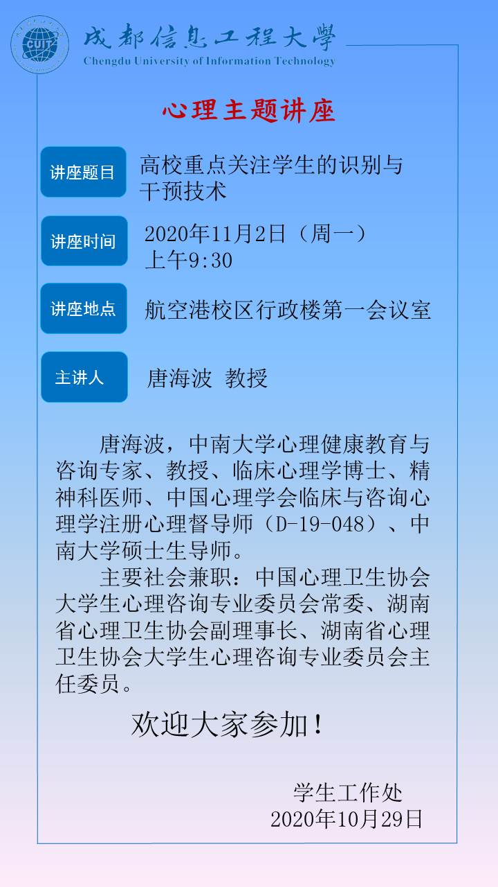 来源:学生工作处 作者:心理健康中心日期:2020-10-30 审核:新闻中心 点击: