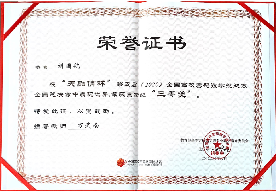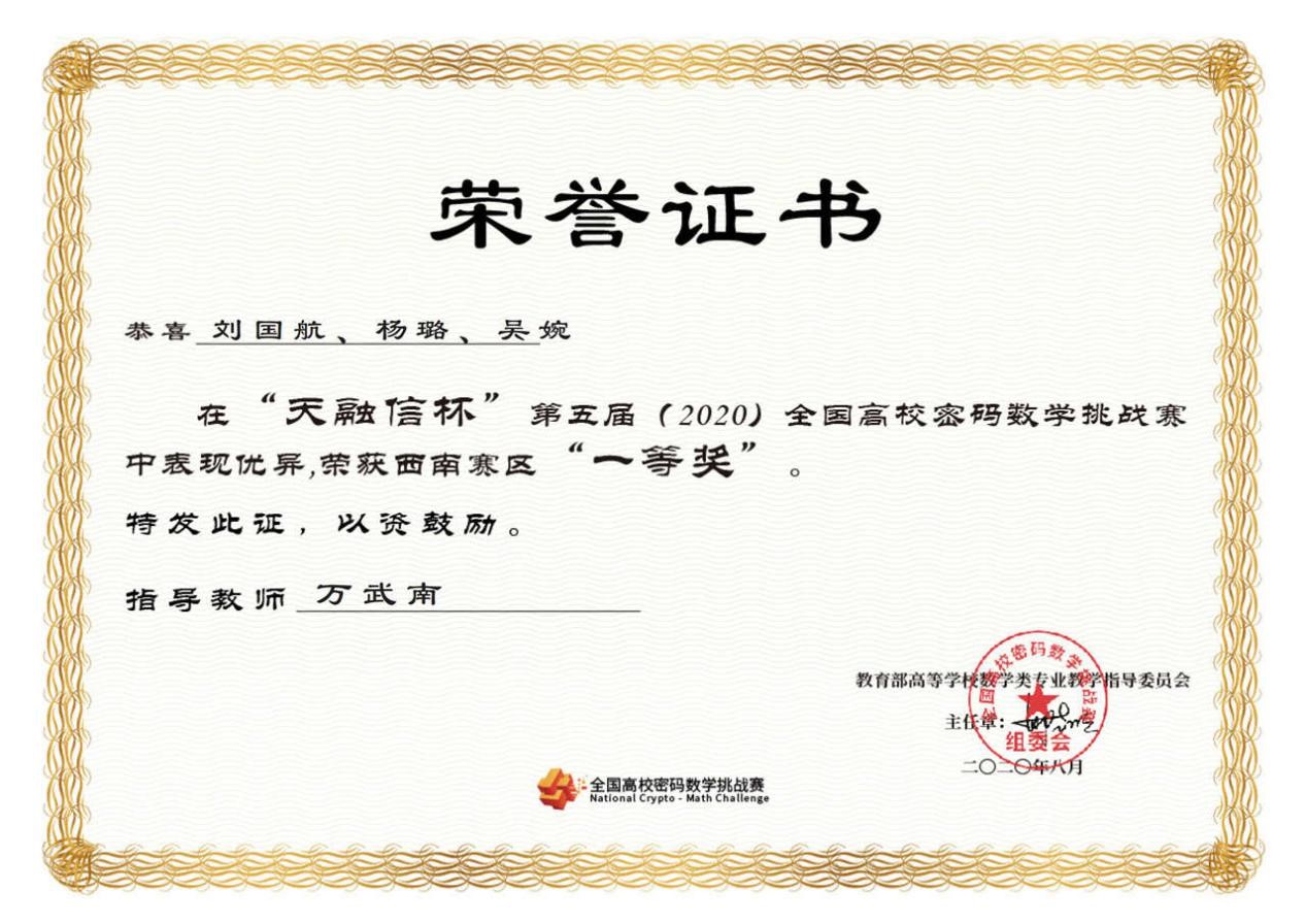 近日,由教育部高等学校数学类专业教学指导委员会、天融信科技集团联合主办的“天融信杯”第五届(2020)全国高校密码数学挑战赛总决赛圆满落幕。九州登录网络空间安全学院的“三只松鼠”战队荣获西南赛区一等奖、国家级三等奖。