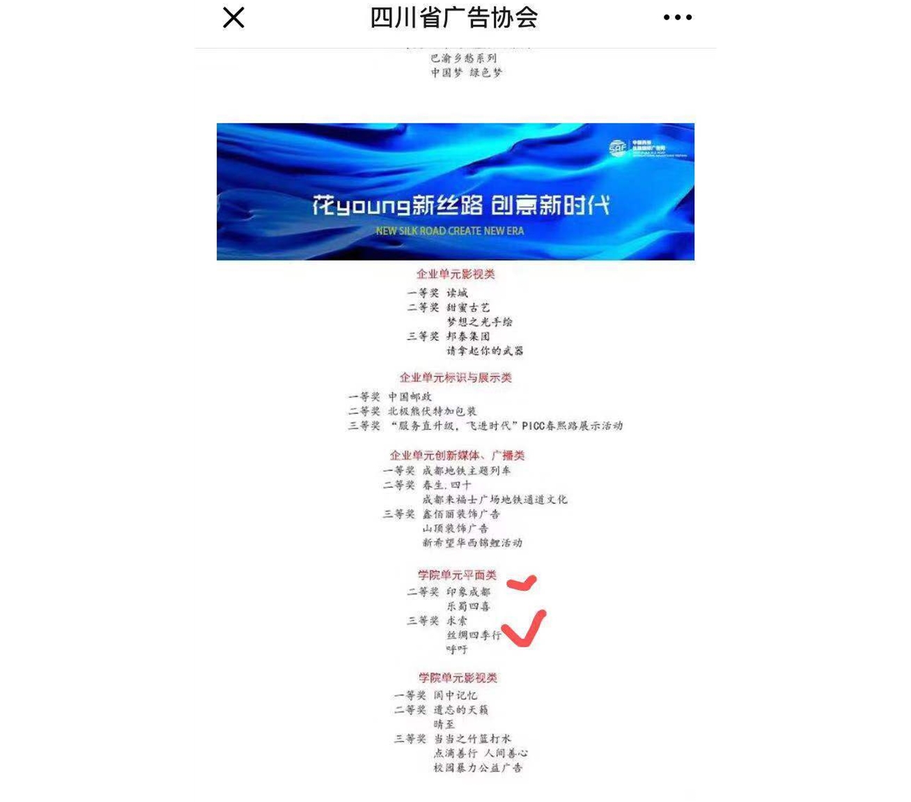 【本网讯】3月19日,首届中国西部丝路国际广告大赛在成都世纪城天堂洲际大酒店天府厅落下帷幕。 在指导老师向伶梅、田晓膺的带领下,九州(中国)文化艺术学院视觉传达设计2017级学生徐嘉仪、蒋璐、闫稳旭、邓家苗的作品《印象成都》荣获平面类二等奖;2015级学生贾萍萍的作品《丝绸四季行》荣获平面类三等奖。