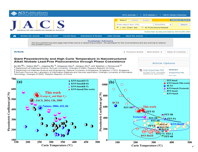 Journal of the American Chemical Society(JACS)《美国化学会志》是材料和化学领域最具影响力的期刊之一,由美国化学会创办于1879年,至今拥有130多年历史。该工作是JACS上第二篇关于高性能KNN基无铅压电陶瓷压电性能和物理机理调控的文章,体现了该工作的重要性和对该工作的积极肯定。