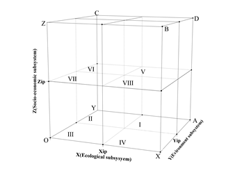 该文章提出的三维评价模型包括社会经济子系统、生态子系统和环境子系统。X轴为生态质量指数水平;Y轴表示环境质量指数水平;Z轴表示社会经济发展水平指数。三维立方体模型分为“I、II、III、IV、V、VI、VII、VIII”八个区块,代表了不同的社会经济发展水平和生态环境质量的综合状况。它涵盖了社会经济发展、生态质量和环境质量的25个指标。将生态质量指数、环境质量指数和社会经济发展指数分为三类;Ⅱ级子系统指数分别作为拐点Xip,Yip,Zip。该论文的研究成果为综合评价领域提供了新方法。