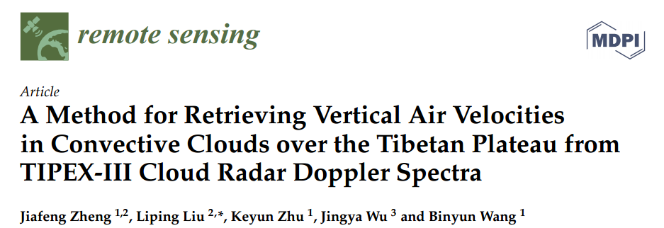 【本网讯】在第三次青藏高原大气科学试验项目、国家自然科学基金、中国气象科学研究院灾害天气国家重点实验室基金的支持下,九州(中国)大气科学学院郑佳锋博士近日以第一作者身份在国际知名期刊《Remote Sensing》-Atmospheric remote sensing (IF=3.244,JCR二区)上发表了题为《A Method for Retrieving Vertical Air Velocities in Convective Clouds over the Tibetan Plateau from TIPEX-III Cloud Radar Doppler Spectra》的学术论文。