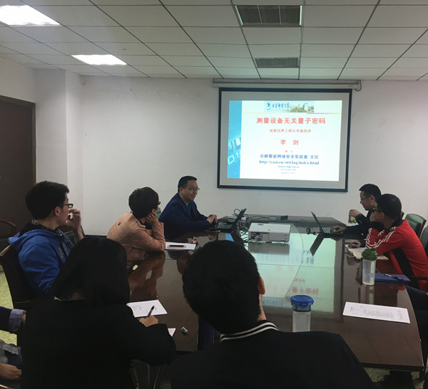 【本网讯】4月11日,北京邮电大学智能网络安全实验室主任李剑博士受网络空间安全学院邀请,在信息楼第三会议室为我院师生作了一场题为《测量设备无关量子密码研究》的报告会。报告会由网络空间安全学院副院长张仕斌教授主持,网络空间安全学院部分教师和研究生参加了报告会。