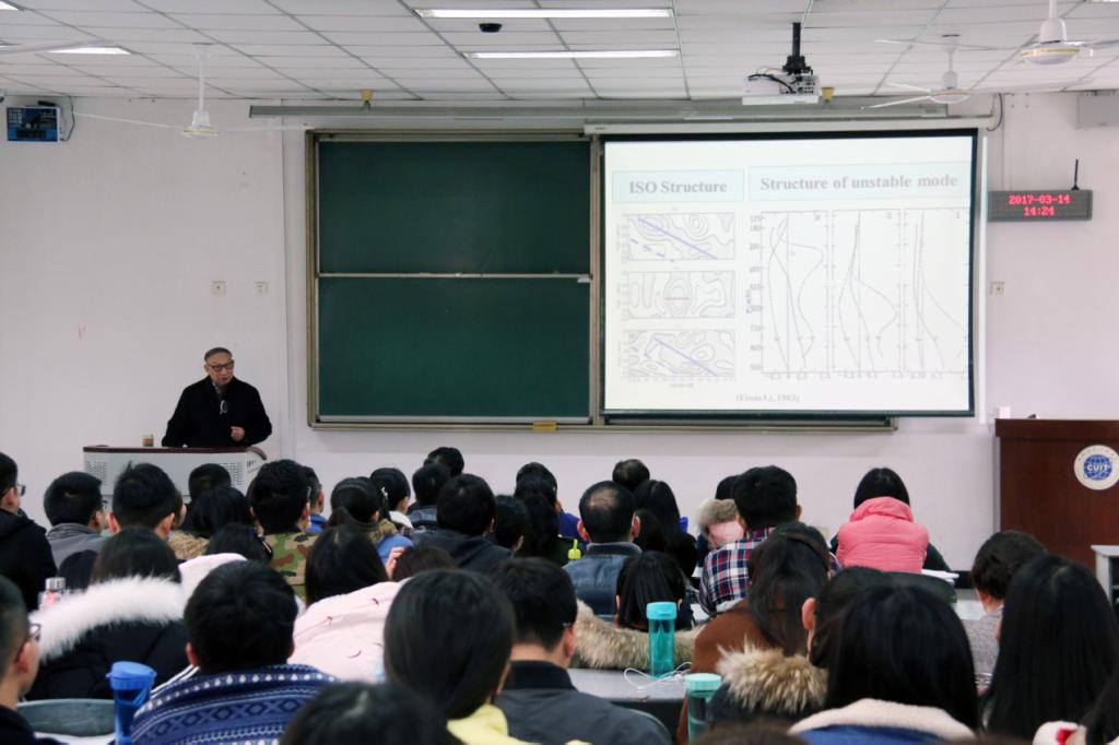 【本网讯】3月14日,中国科学院大气物理研究所李崇银院士应大气科学学院邀请,在1301教室开展了题为《MJO研究的几个重要前沿问题》的学术报告。报告由大气科学学院陈权亮教授主持,吕世华研究员、张宇教授、巩远发教授等老师及部分研究生参加了此次讲座。