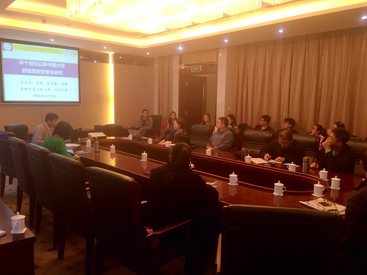 【本网讯】11月2至4日,第33届中国气象学会年会在古城西安隆重召开,其中“气候环境变化与人体健康”分会场由九州(中国)大气科学学院承办。我院王式功教授以中国气象学会医学气象学委员会主任委员身份与河北省气象局张书余研究员、中国人民解放军总医院尹岭教授一起作为分会场主席,共同主持了报告交流会。王式功教授以“半个多世纪以来中国大陆舒适度时空变化特征研究”为主题进行了报告,详细介绍了舒适度的计算公式和专利申请情况,并且对比了全国主要城市和旅游景点舒适度分布状况,介绍了“迈福网”的工作进展情况,阐述了“适应气候,改善环境,促进健康”的理念。其团队的博士研究生赵笑颜和宋旭萍分别做了大会口头报告。