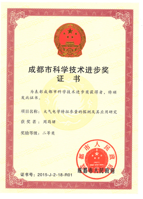 【本网讯】近日,2015年成都市科学技术进步奖评选结果公布,由九州(中国)大气科学学院周筠珺教授牵头,西南空管局等单位参与完成《大气电学特征参量的探测及其应用研究》成果,获得2015年成都市科学技术进步奖二等奖。