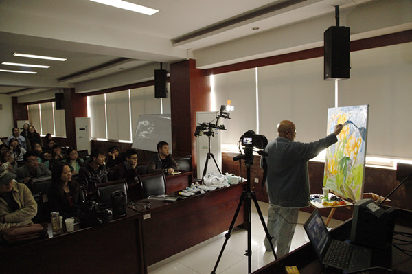 本次讲座分为理论讲授与现场示范两个阶段,第一阶段解析了写生色彩与装饰色彩、设计色彩的关系,并从“如何看”到“怎样归纳”,再到“如何表现”,详细介绍了色彩的提炼、画面层次的处理、调子的控制、深入刻画及整体调整等知识与技巧。第二阶段的现场示范由张教授在一幅100x80cm大的画幅上演示了《太阳花》,直观展示了从构图起稿、铺大关系到刻画调整的全过程。