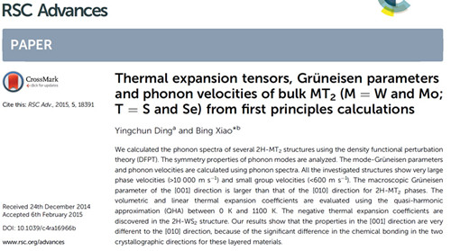 【本网讯】光电技术学院材料计算模拟团队丁迎春老师于2015年2月以第一作者身份在英国皇家化学学会RSC(The Royal Society of Chemistry)主办的国际著名期刊《RSC Advances》(最新影响因子3.708)杂志上发表了题为《Thermal expansion tensors, Grüneisen parameters  a nd  phonon velocities of bulk MT2 (M = W a nd Mo; T = S a nd Se) from first principles》的学术论文(RSC Adv., 2015, 5, 18391)。