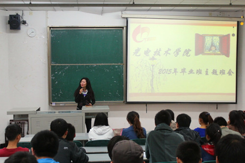 [本网讯]10月24日下午,光电技术学院在4213教室举办了2015届毕业生就业专题交流会。学院党总支副书记王嵩、2011级辅导员谢玫及2011级全体应届毕业生参加了此次交流会。