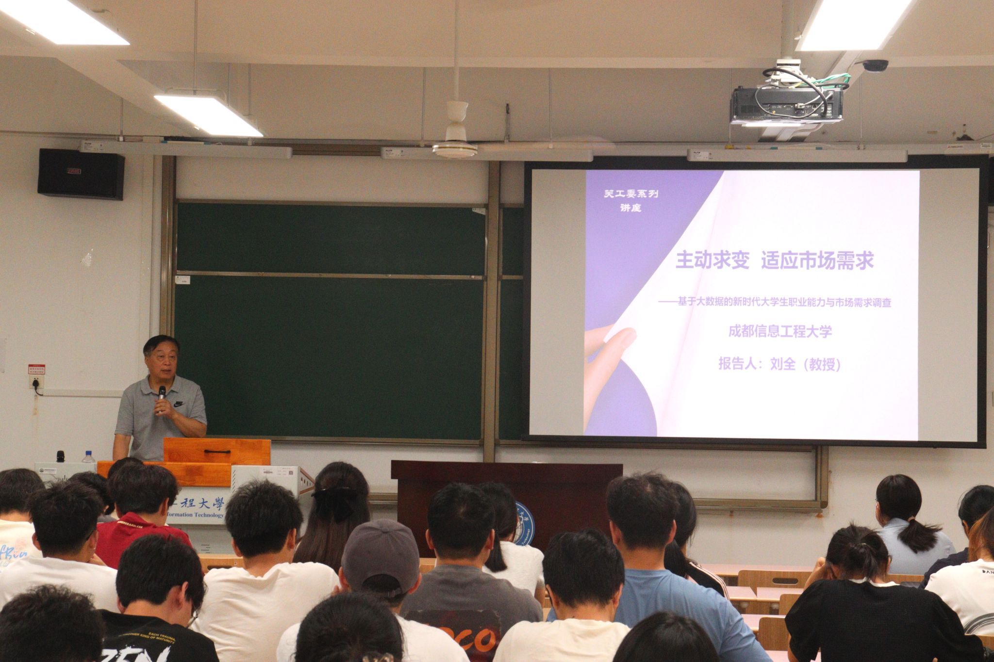 刘全教授作了题为《主动求变 适应市场需求——基于大数据的新时代大学生职业能力与市场需求调查》的讲座。他从“当今世界百年未有之大变局”“高质量发展战略内涵、背景和实践取向”“基于大数据的新时代大学生职业能力与市场需求调查”三个方面深度解析新时代带来的人才培养新机遇。当今竞争激烈的社会环境,是机遇,更是挑战,他希望同学们在学好专业的前提下要认真思考如何培养自己分析问题、解决问题、实践创造、组织协调等方面能力,并付诸行动提升自我,练就过硬本领,不懈奋斗,肩负起时代赋予的重任。