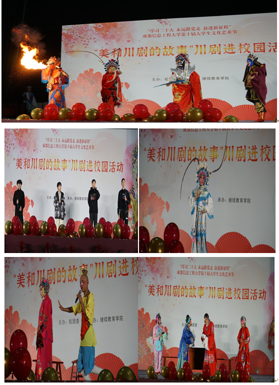 继续教育学院带来的《戏曲串烧》拉开了整场晚会的序幕。《川剧变脸吐火》赢得满堂喝彩,《别洞观景》以优美的舞蹈身段表现情节点燃现场氛围,《劝夫》和《死水微澜》得到了师生们的广泛好评,《皮金滚灯》言语诙谐、不拘一格,把晚会气氛推向了高潮,晚会以《拜新年》落下帷幕。