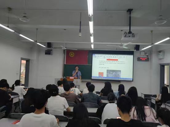 黄波老师以电影《建国大业》主题曲《追寻》开场,和同学们一起回到中国共产党带领全国人民追求民族解放和人民自由的光辉岁月中,感受共产党人无悔的忠贞和不懈的追寻;以《红岩》一书中的经典场面“狱中绣红旗”为切入点,讲述了党的百年历史和共产党人在艰苦的环境下不忘初心、牢记使命的故事;以自己在大学期间阅读世界名著的经历,向同学们阐述了自己对坚持社会主义道路重要性和必要性的体会;黄波老师还以自己在新中国建设中的亲身经历,激励同学们多读书、加强社会实践,历练本领,不负党和人民的重托,薪火相传,担负起实现第二个百年奋斗目标的神圣历史使命。