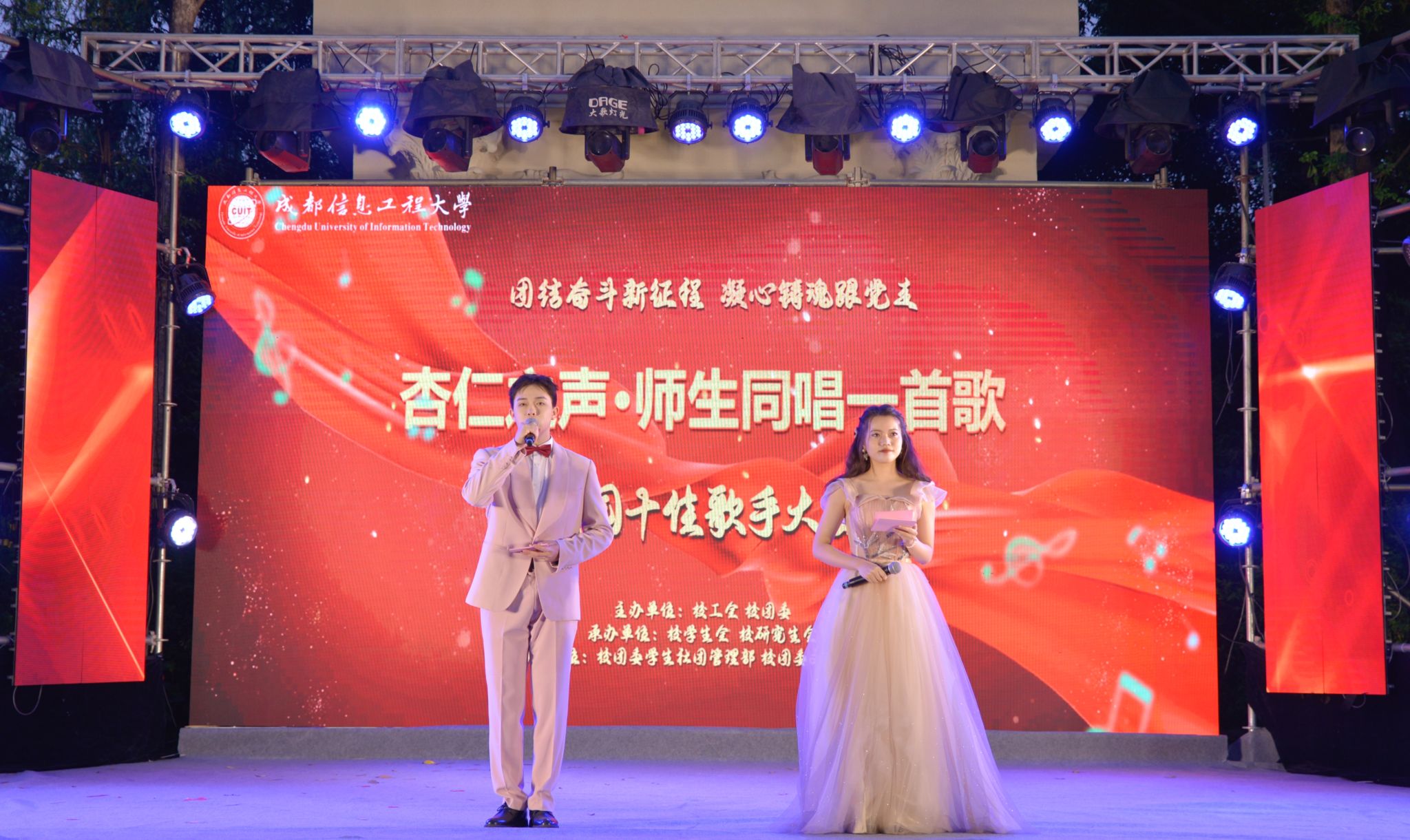 【本网讯】4月21日晚上19:00,为响应学校党委号召“学习二十大,永远跟党走,奋进新征程”,由校团委和校工会主办、校学生会、校研究生会承办的“团结奋斗新征程,凝心铸魂跟党走”杏仁之声——师生同唱一首歌校园十佳歌手大赛总决赛在航空港校区未来广场举行,学校党委常委、宣传部部长张小红,主办单位负责人校工会常务副主席周波、校团委副书记倪涛出席本次活动,出席活动的还有学校职能部门、各学院领导。