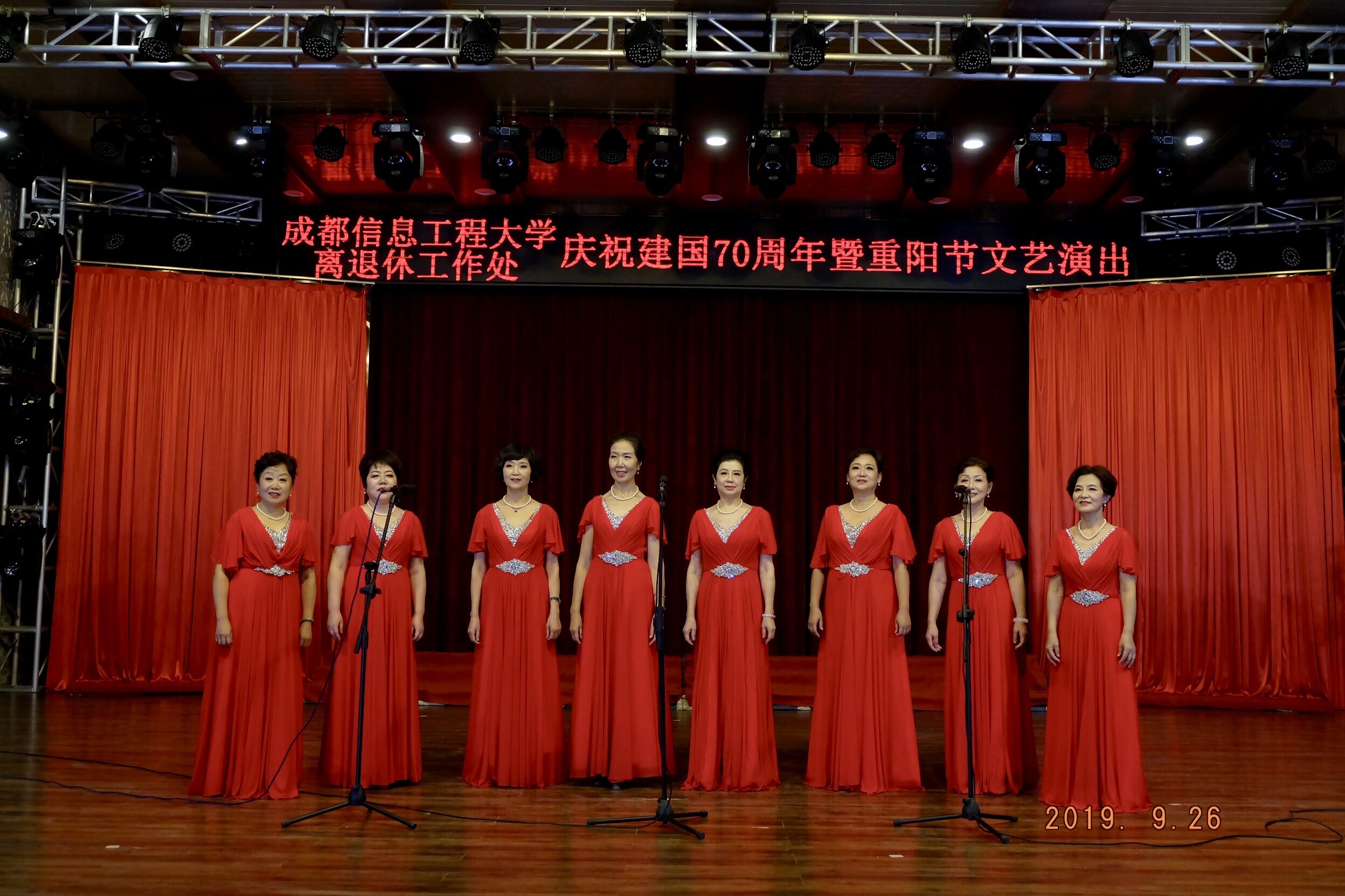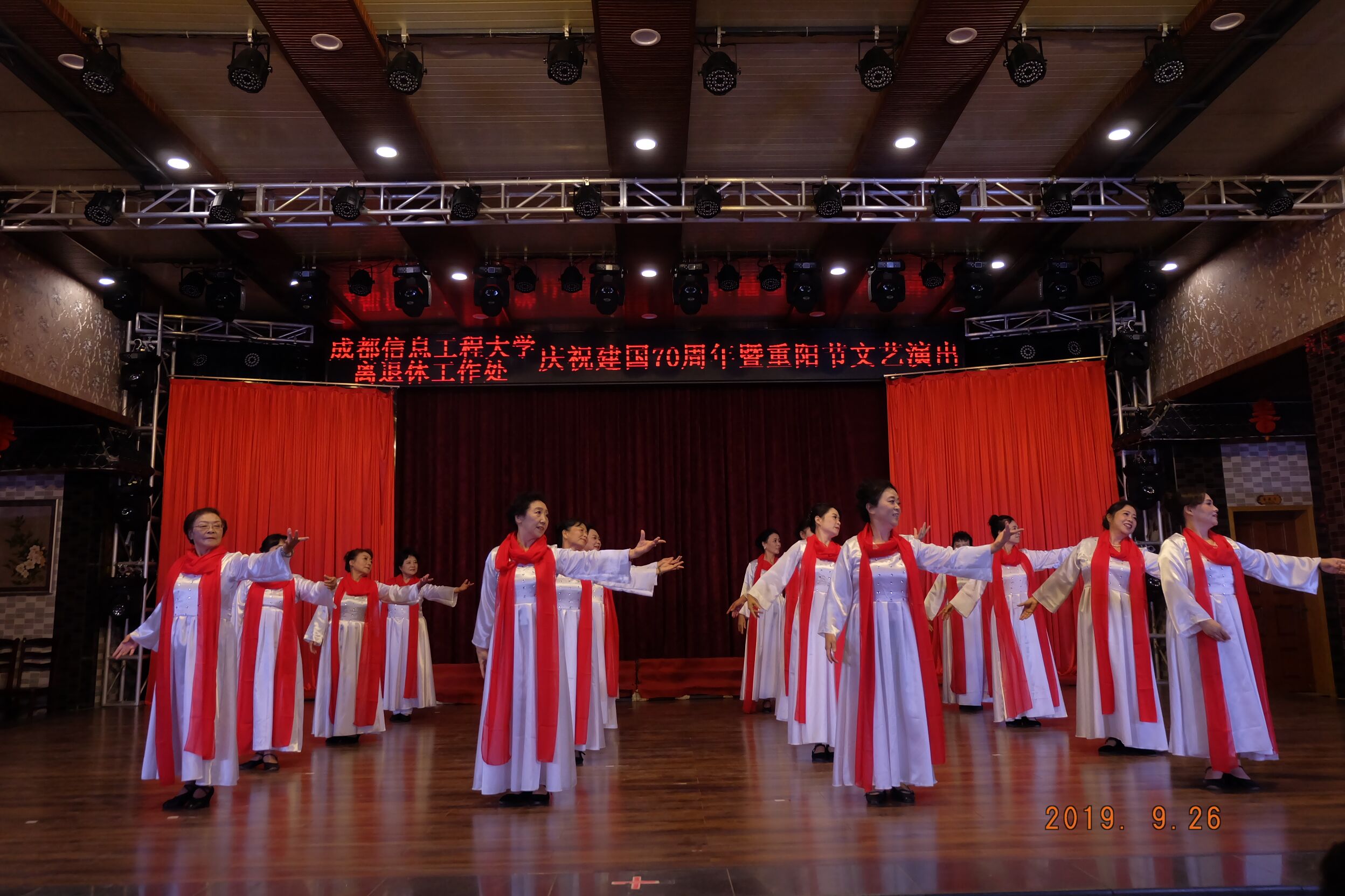 为表达中华儿女对中华人民共和国成立70周年的祝福,学校离退休老师经过几个月的精心排练,上演了一台精彩纷呈的文艺演出:有盛赞祖国的诗歌朗诵《祖国颂》《祖国,一首唱不完的恋歌》,有反映新农村建设的舞蹈《老磨坊》,有歌唱祖国的女声小合唱《我用歌声拥抱祖国》《我的姐妹兄第》,强身健体的中华通络操,还有表现离退休老师把最美的青春岁月献给亲爱的祖国,献给学校的舞蹈《芳华》……老师们的精彩表演,赢得观众阵阵掌声。在全体人员大合唱《我和我的祖国》歌声中,演出圆满结束。