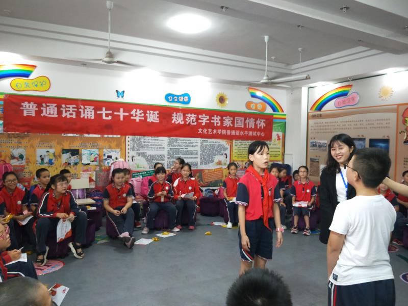 经国务院批准,自1998年起,每年9月第三周为全国推广普通话宣传周。2019年9月16日至22日是第22届全国推普周,本届全国推广普通话宣传周以“普通话诵七十华诞,规范字书爱国情怀”为主题。在学校相关部门的支持下,文化艺术学院普通话水平测试中心的志愿者还前往成都市龙泉驿区同安小学开展“推普校园行”活动,积极发挥当代青年大学生的社会价值以及学校宣传贯彻实施《国家通用语言文字法》的基本阵地作用。把普及普通话、促进语言文字规范化活动同学校的相关校园文化建设系列活动结合起来,切实提高四川方言区中小学生的语言文字规范意识和用语用字规范化水平,积极倡导“普通话诵七十华诞,规范字书爱国情怀”。