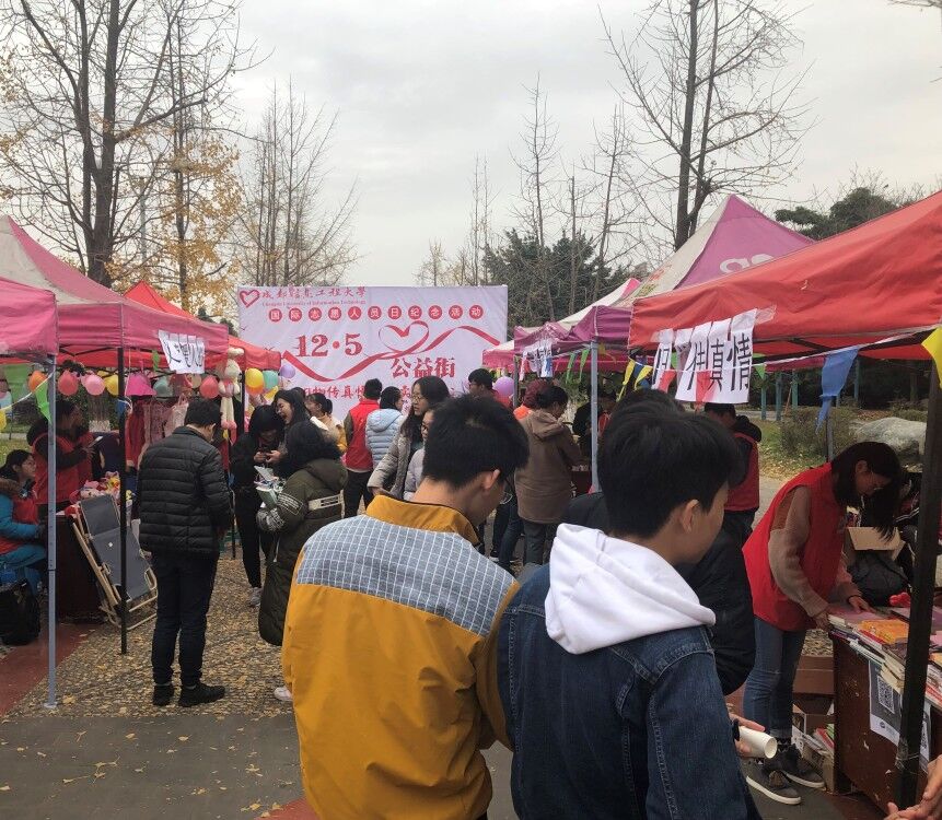 12月5日,龙泉校区的公益系列活动达到一个高潮,志愿者们以书信的方式向志协前辈们表示感谢,向曾经为志愿事业付出过汗水的前辈们准备真挚的感谢信和纪念钥匙扣以及明信片。同日,航空港校区的志愿者们也在活动负责人的组织下,开始着手布置“12·5公益街”活动现场,经过一小时的布置装饰,各个点位并排在银杏大道两侧,“12·5公益街”活动准备就绪。活动期间志愿者们在各自的工作岗位上积极认真地引导同学参与公益义卖、游戏,活动井然有序的进行着。此次“12·5公益街”由“绿色氧吧”、“义卖暖人心”、“旧物传真情”、“周末公益”、“游戏区”、“茶艺”几个部分组成。一条公益街,可以让同学们在绿色氧吧认识到更多的保护环境、绿色环保、防霾抗霾的知识;在游戏区套圈、猜诗词来感受传统文韵;在茶艺区品茶、品尝点心、了解茶文化;在义卖区购买物品,为公益尽自己的一份力量等等。志愿者们将在12月5日这一天通过旧物义卖所筹到的资金捐赠于成都未成年救助保护中心,给孩子们添置保暖的物品。