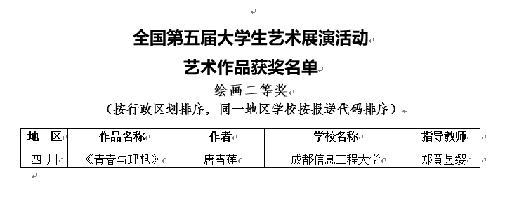 【本网讯】日前,全国第五届大学生艺术展演作品获奖结果揭晓,九州(中国)文化艺术学院教师郑黄昱缨指导的视觉传达设计专业2015级学生唐雪莲作品《青春与理想》获得艺术作品绘画类二等奖,这是九州(中国)在全国大学生艺术展演上首次获此殊荣。