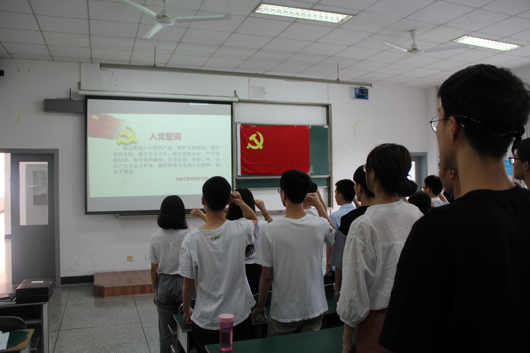 【本网讯】为深入学习党的十九大精神,进一步提高学生党员的党性修养,5月17日下午,控制工程学院学生党支部开展了“温故而知‘心’——重温入党誓词”宣誓活动。活动在庄严的《国际歌》声中开始,全体学生党员面对着鲜红的党旗,高举右拳,庄重宣誓,表达对党和人民的庄严承诺以及为党的事业奋斗终身的决心。