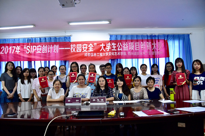 【本网讯】7月4日,文化艺术学院举行了“2017年“四川省SIP安创计划—校园安全”大学生公益项目创新大赛颁奖典礼。从今年5月发布大赛公告开始,“四川省SIP安创计划—校园安全”大赛获得了全校师生的积极响应,经过了申报、答辩到最终的立项,每一个项目都凝聚了成信大师生对“安全”的关注,让“安全”的内涵经历了创新、升华、丰富。大赛也同时获得来自四川省安全生产监督管理局和四川省职业健康协会的关注,其中6个项目脱颖而出将陆续在成都市范围内落地实施。学院院长廖思湄、副院长徐翀为获奖团队颁奖,成信大师生将继续用自己的智慧和创新为社会服务,续写“校园安全”的华美篇章。