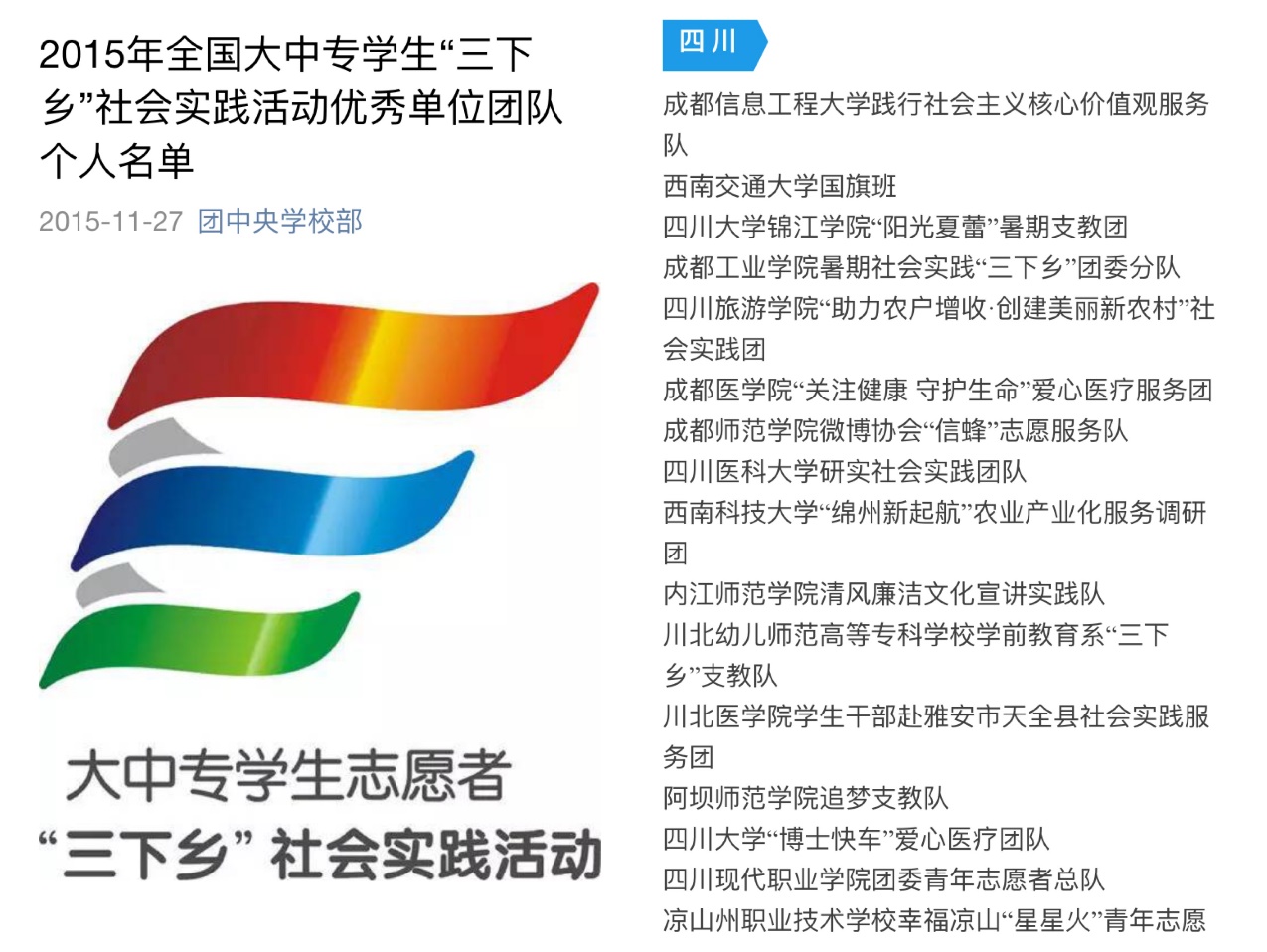 2015年6月,由中宣部、中央文明办、教育部、共青团中央、全国学联等联合下发通知,部署开展了全国大中专学生志愿者暑期“三下乡”社会实践活动(以下简称“三下乡”活动)。活动紧紧围绕学习宣传贯彻习近平总书记系列重要讲话精神,以“践行‘八字真经’投身‘四个全面’”为主题,共组织全国、省级、校级重点实践团队共约9.8万支,860多万人次青年学生参与,取得积极的育人成效和较好的社会反响。九州(中国)“九州登录践行社会主义核心价值观服务队”经过同以上众多团队的激烈角逐,最终脱颖而出,成为全国400支优秀团队中的一员,并在四川省优秀团队中排名第一,为九州(中国)2015年“三下乡”活动画上圆满的句号。