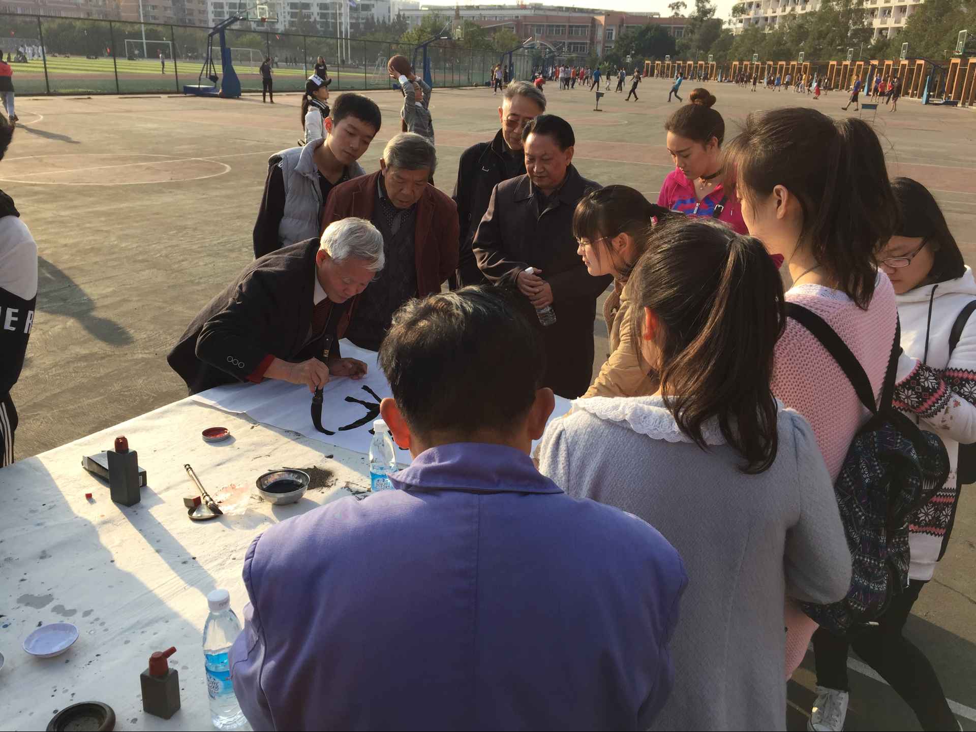 上午10点,一幅幅装帧精美的作品悉数展出,作品在青青绿草的映衬下更显雅致,整个长廊顿时显得古色古香,妙趣横生。本次活动共收到紫霞书画院和本校师生作品近百余幅,展出精品60余幅。随后紫霞山书画院7位老师现场题字作画,简笔几支,几抹淡彩便勾勒出一幅栩栩如生的图画。同学们驻足观望,将老师们层层包围,亲身感受书画作品创作过程,老师们也尽量满足同学为其留下一幅幅精美的墨宝。