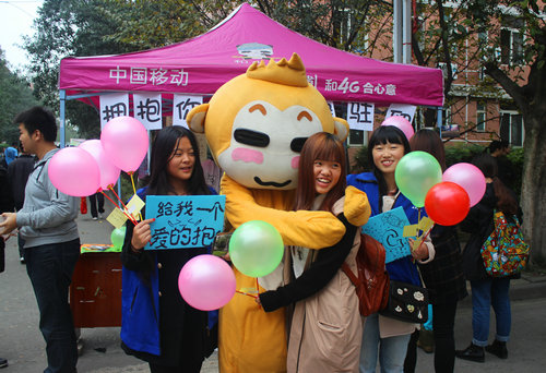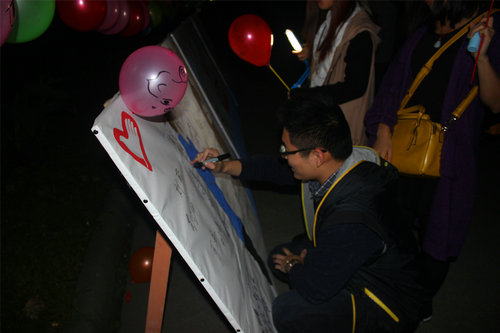 当天中午,一部分志愿者穿上动物套装与来往的同学们相互拥抱,一部分志愿者向同学们分发明信片和贴有便利贴的气球,上面写着以“祝福,友爱,相亲,理解”为主题的内容。晚上,志愿者们继续给来往的同学发放气球并引导同学们在主题板上留下自己的名字。收到问候的同学们对志愿者表达内心的感谢之情并开心地离开了现场。