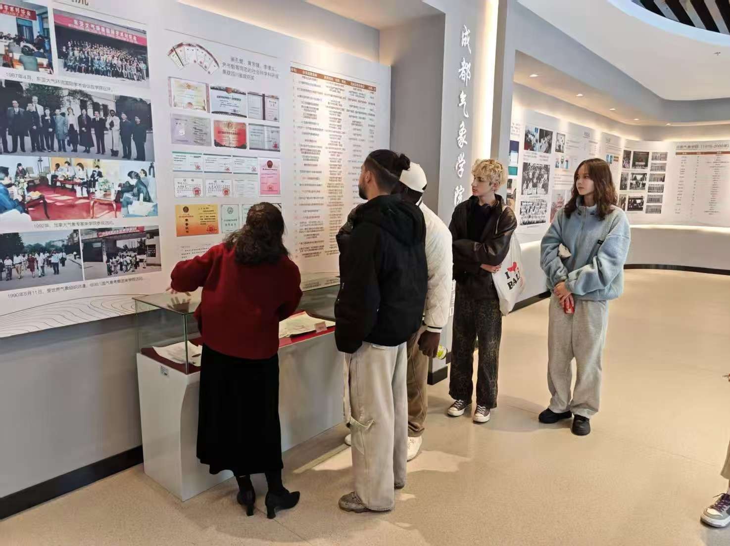 校史馆内,珍贵的历史档案、泛黄的老照片、见证时代的实物展品与数字化互动展项交相辉映。留学生们驻足于学校历程展区,通过特色学科建设等主题单元,系统了解学校从 1951 年建校至今,在气象、统计、信息学科领域的积淀传承。在大气探测博物馆,气象探测新装备、雷达数据融合系统、健康气象研究成果等创新实践案例,生动展现了学校服务国家战略需求的担当作为。