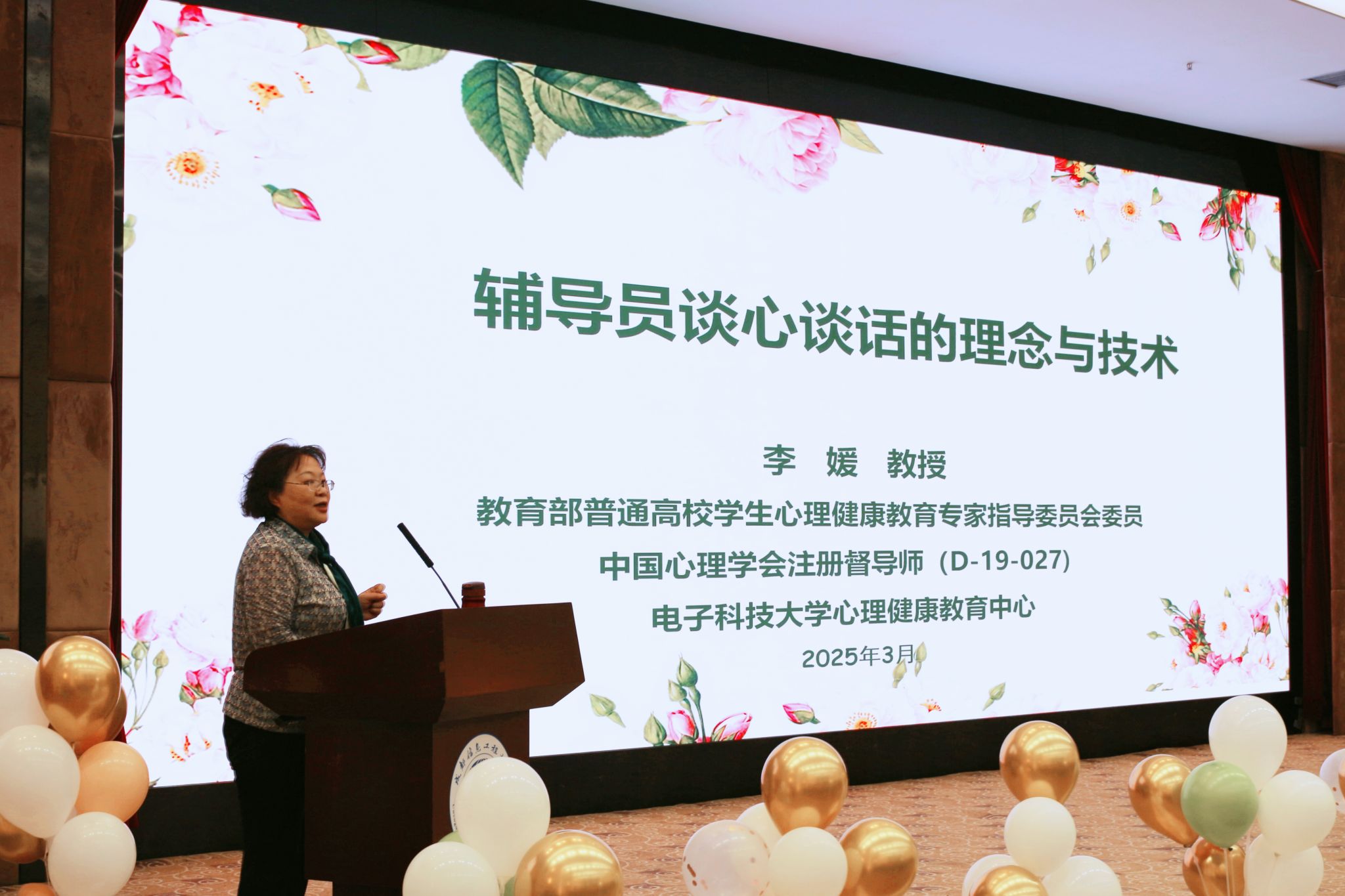 本次讲座由四川省心理学会大学生心理健康教育专委会主任委员、电子科技大学教授李媛主讲,讲座主题为“点亮心灵灯塔·探秘沟通艺术——心理育人工作中的谈心谈话理念与技术”。来自省内各高校心理健康教育工作队伍及九州登录的近300名师生到场参会。