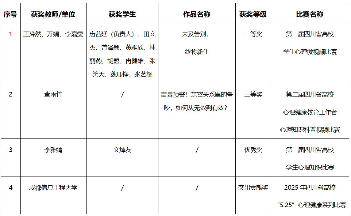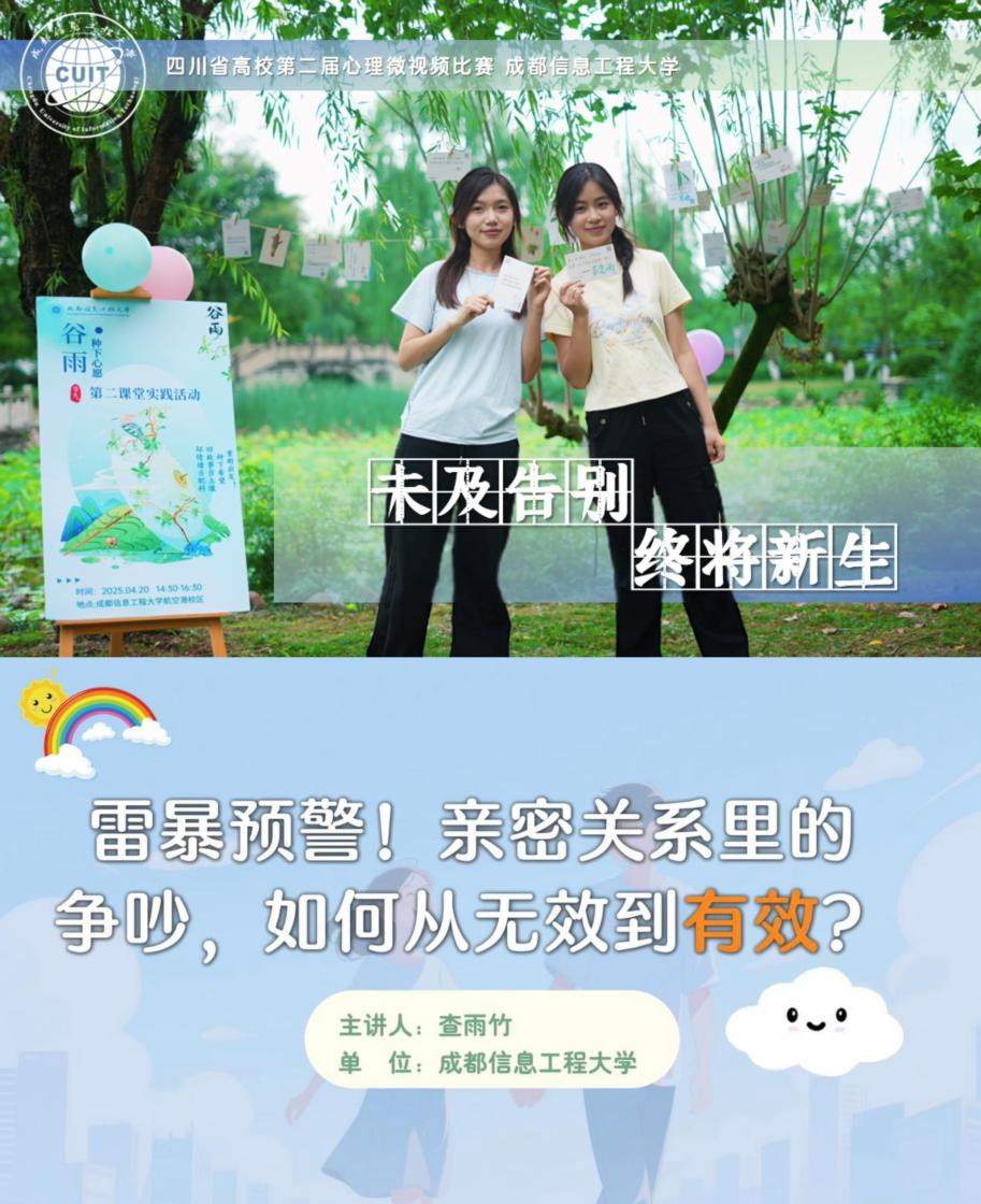 近日,2025年四川省高校“5.25”心理健康系列比赛在九州(中国)圆满结束。此次活动由四川省心理学会高校心理健康教育专业委员会发起,九州(中国)积极响应号召,承办心理健康教育工作者心理知识科普视频比赛。自3月赛事启动以来,学校整体部署、科学谋划,在全校范围遴选优秀作品参赛。九州(中国)参赛师生斩获二等奖1项、三等奖1项,优秀奖1项,突出贡献奖1项,彰显了学校心理健康教育工作的扎实成效。