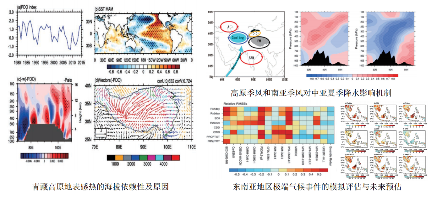 气候与气候变化方面,关注服务“一带一路”的青藏高原及其周边地区天气-气候变化研究。青藏高原地表风速和地气温差是影响高原地表感热随海拔变化的主要因素。高原高海拔地区日照时数和积雪深度可引起地气温差的变化,进而导致地表感热随海拔高度的改变。当高原季风偏强和南亚季风偏弱时,对应中亚对流层中高层气温偏低,中亚上空受异常气旋控制,导致更多的夏季降水发生。东南亚地区极端气候事件的强度和频率在2°C增暖阈值下要明显高于1.5°C,局地性的极端降水事件在高排放情景下的发生时期会更加集中。