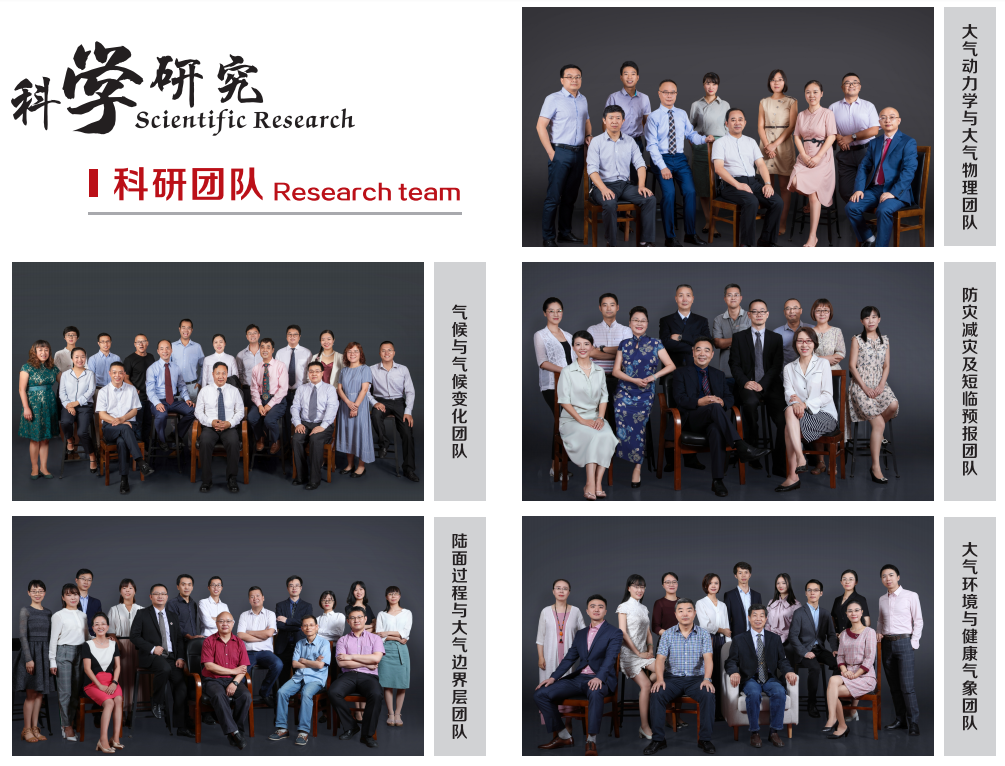 科研团队有大气动力学与大气物理团队、气候与气候变化团队、防灾减灾及短临预报团队、陆面过程与大气边界层团队、大气环境与健康气象团队。