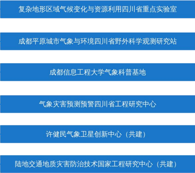 学院目前拥有复杂地形区域气候变化与资源利用四川省重点实验室、气象灾害预测预警四川省工程研究中心、成都平原城市气象与环境四川省野外科学观测研究站等省部级科研与创新平台,并建有气象预报四川省实验教学示范中心、气象预报四川省虚拟仿真实验教学中心以及蜀南山地生态气象综合观测试验站、西南空管局航空气象创新联合实验室、中电投电力工程有限公司电力气象联合实验室、九州登录云南自然灾害防御技术研发中心等教学研究平台。学院建有九州登录气象科普基地,是以气象防灾减灾、气候变化和生态文明为特色的国、省、市三级科普基地。